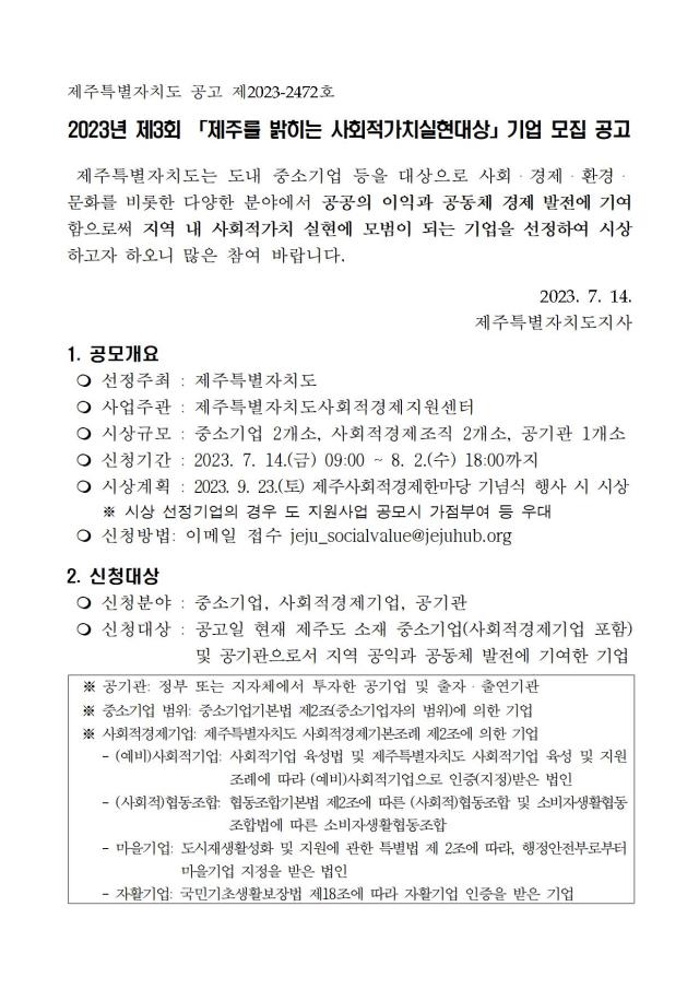[공고] (제주도) 2023년 제3회 「제주를 밝히는 사회적가치실현대상」기업모집 공고 (~8.2)