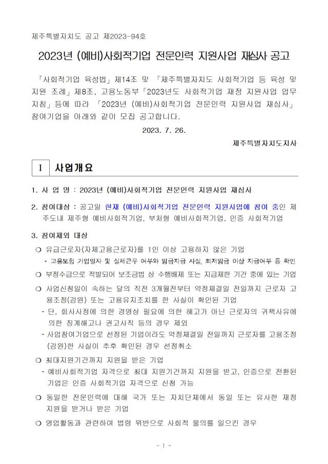[공고] (제주특별자치도) 2023년 (예비)사회적기업 전문인력 지원사업(8차) 재심사 공고 (상시접수)