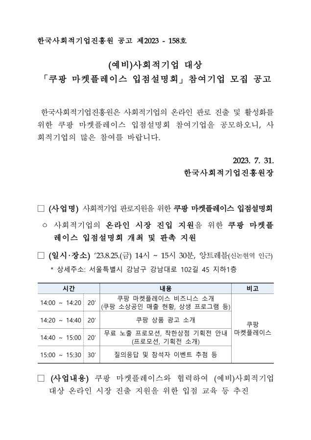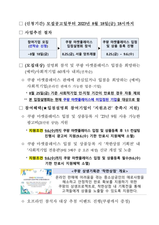 [공고] (한국사회적기업진흥원) (예비)사회적기업 대상 「쿠팡 마켓플레이스 입점설명회」 참여기업 모집 공고 (~8.18)