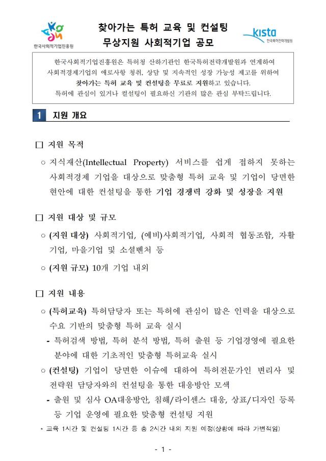 | 제목 | [공모] (한국사회적기업진흥원) 찾아가는 특허 교육 및 컨설팅 무상지원 사회적기업 공모 (~8.31) |