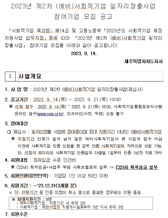 「사회적기업 육성법」제14조 및 고용노동부「2023년도 사회적기업 재정지원사업 업무지침」등에 따라 「2023년 제2차 (예비)사회적기업 일자리 창출사업」 참여기업 모집을 아래와 같이 공고합니다.