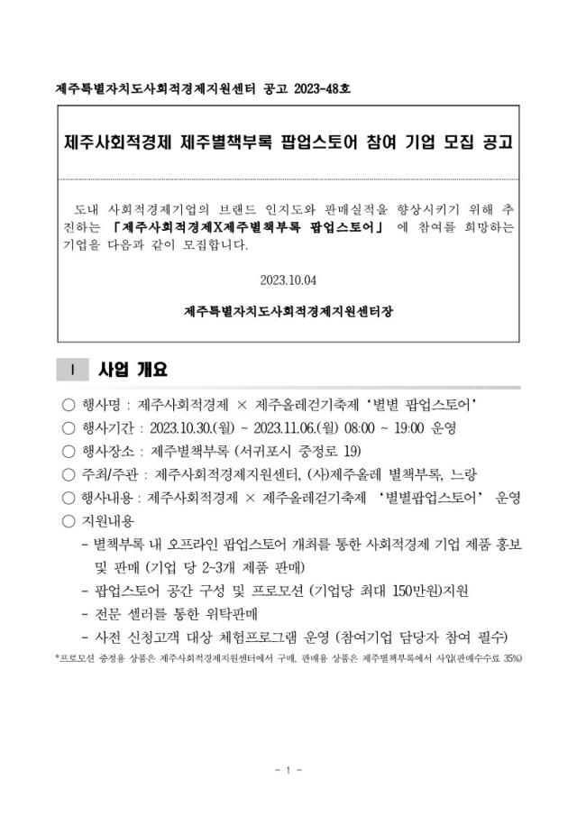 [공고] (제주사회적경제지원센터) 제주사회적경제X제주올레걷기축제 별별팝업스토어 참여기업 모집 (~10.12)