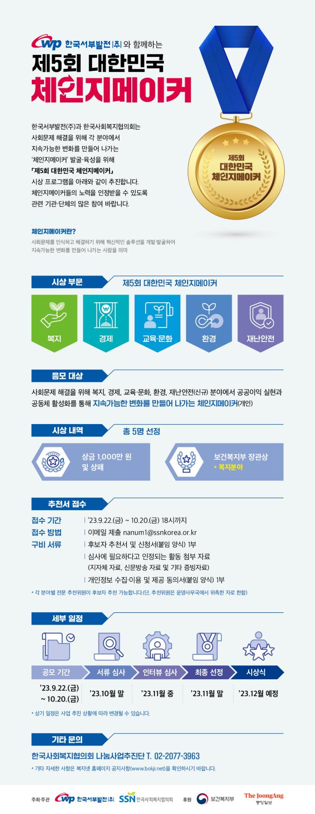 한국서부발전(주)와 한국사회복지협의회는 사회문제 해결을 위해 각 분야에서 공공이익 실현과 공동체 활성화를 통해 지속가능한 변화를 만들어 나가는 ‘체인지메이커(혁신가)’ 발굴·육성하는 「제5회 대한민국 체인지메이커」 시상 프로그램을 추진하고 있습니다.