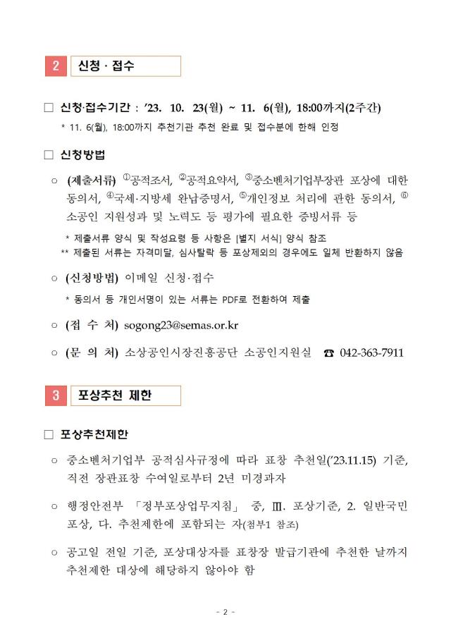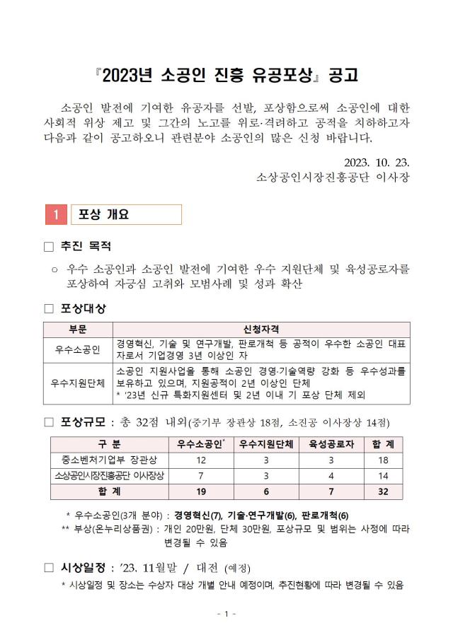 [공고] (소상공인시장진흥공단) 「2023년 소공인 진흥 유공포상」공고 (~11.6)