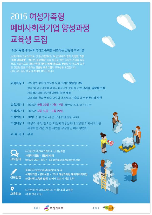 2015년 여성가족형 예비사회적기업 양성과정 교육생을 아래와 같이 모집합니다.