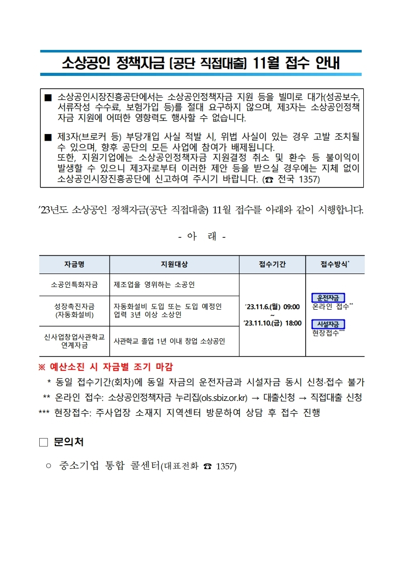 소상공인정책자금(직접대출) 11월 접수 안내