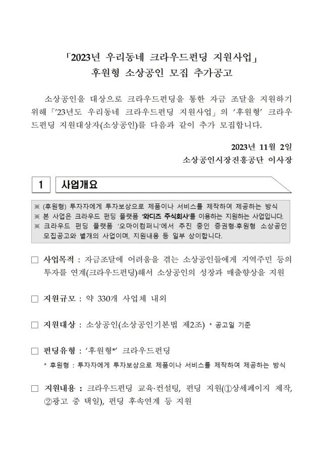 [공고] (소상공인시장진흥공단) 2023년 우리동네 크라우드펀딩 지원사업 후원형 소상공인 모집 추가공고 (~11.20)
