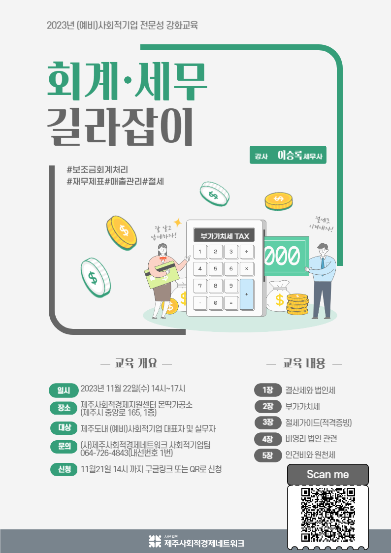 [안내] (제주사회적경제네트워크) 2023년 (예비)사회적기업 전문성 강화교육(회계/세무) (11.22)