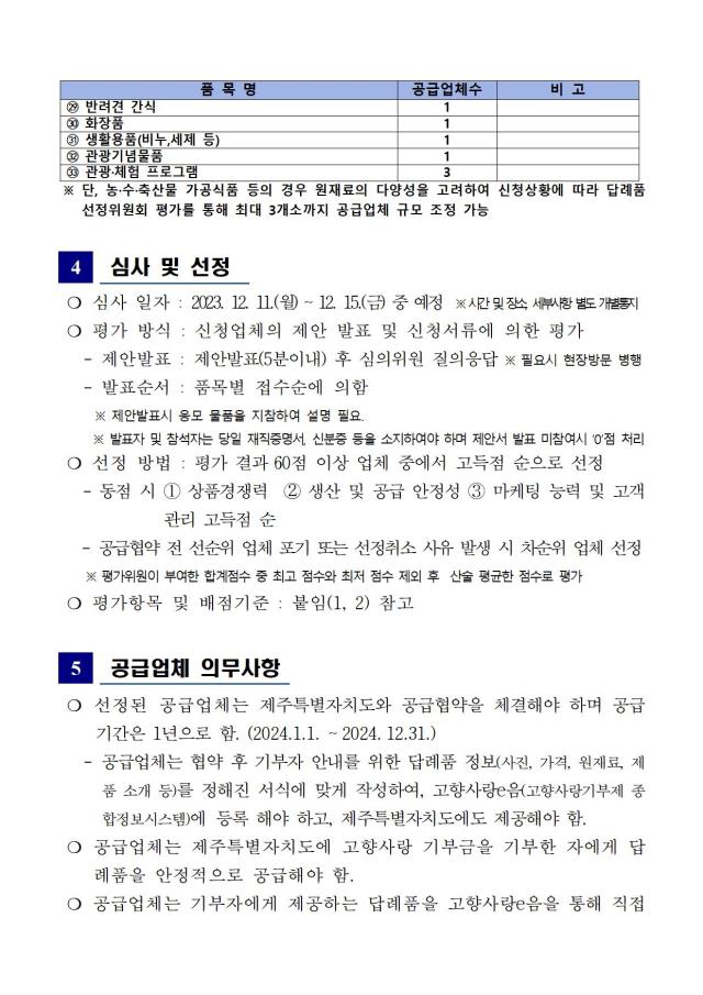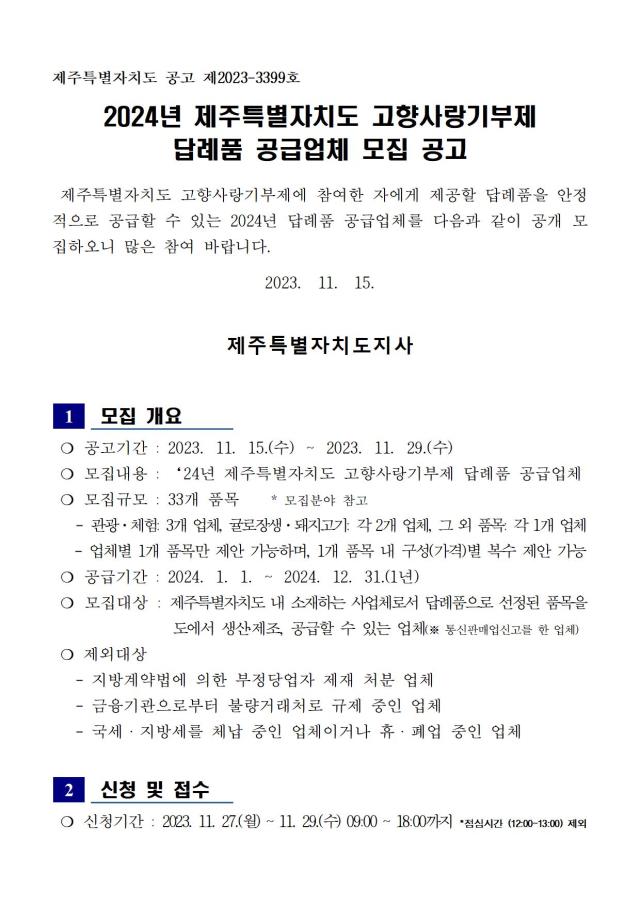 [공고] (제주특별자치도) 2024년 제주특별자치도 고향사랑기부제 답례품 공급업체 모집 공고 (~11.29)
