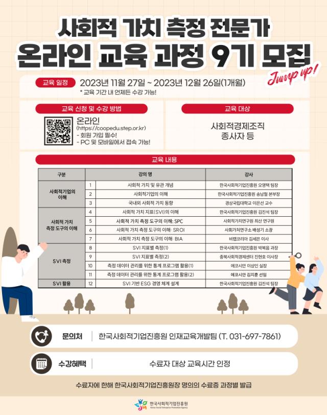 [모집] (한국사회적기업진흥원) 사회적 가치 측정 전문가 교육 온라인 교육 과정 9기 모집 안내 (~12.26)