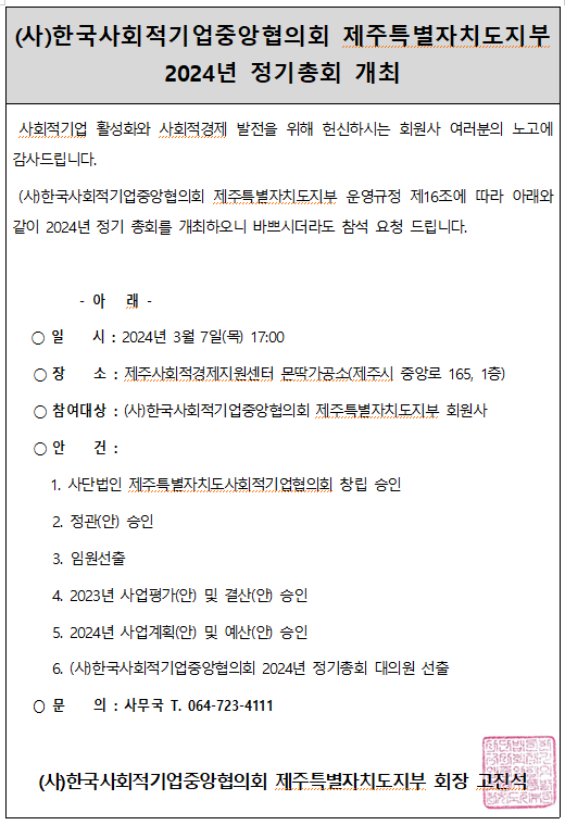 (공고) (사)한국사회적기업중앙협의회 제주특별자치도지부 2024년 정기총회 개최