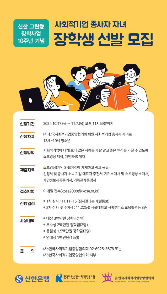사회적기업 종사자 자녀 장학생 선발 모집(신한그린애 장학사업 10주년)