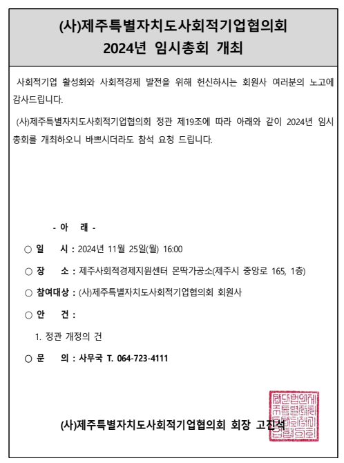 사)제주특별자치도사회적기업협의회 2024년 임시총회 개최