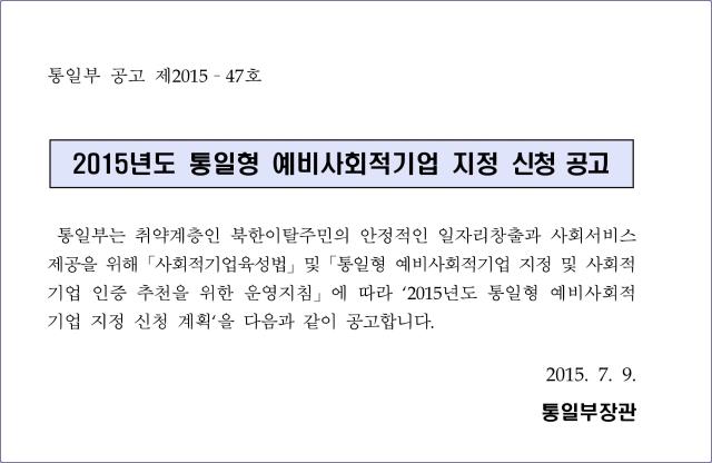 `2015년도 통일형 예비사회적기업 지정 신청 계획`을 공고하였습니다.?