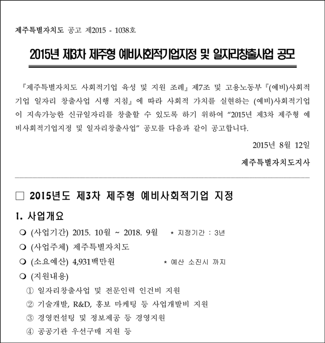 「2015년 제3차 제주형 예비사회적기업 지정」? 및