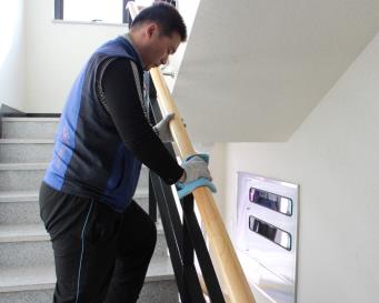 계단 쓸기, 유리창틀 닦기, 구조물 닦기, 엘리베이터 청소, 유리 닦기, 출입문 닦기 등 전체적인